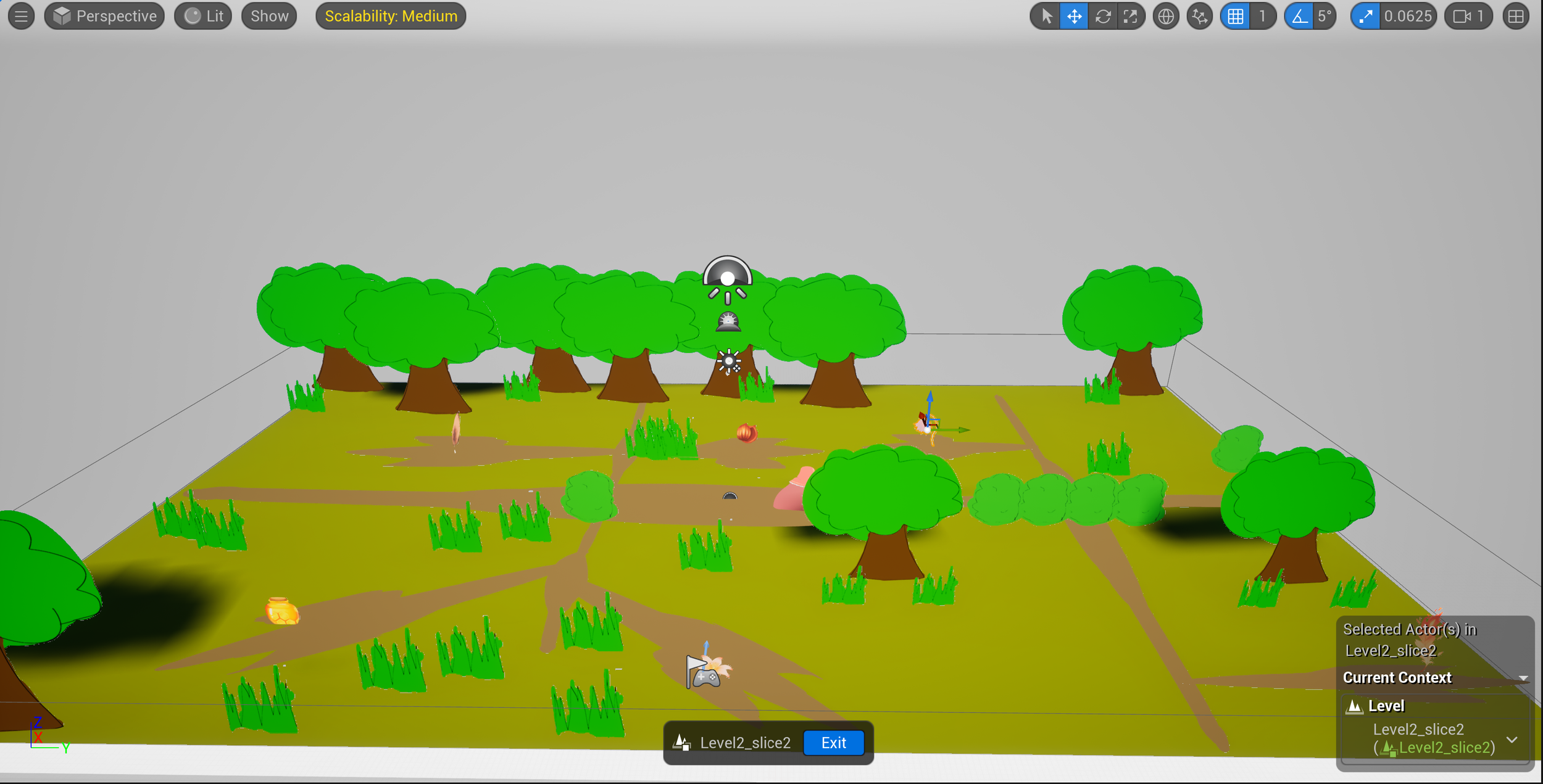 This is a level that I created using placeholder assets provided to me. The level I made is one where the player can take different paths to find “ingredients” in the game world, which they can later craft into books in Bookcrafting mode.